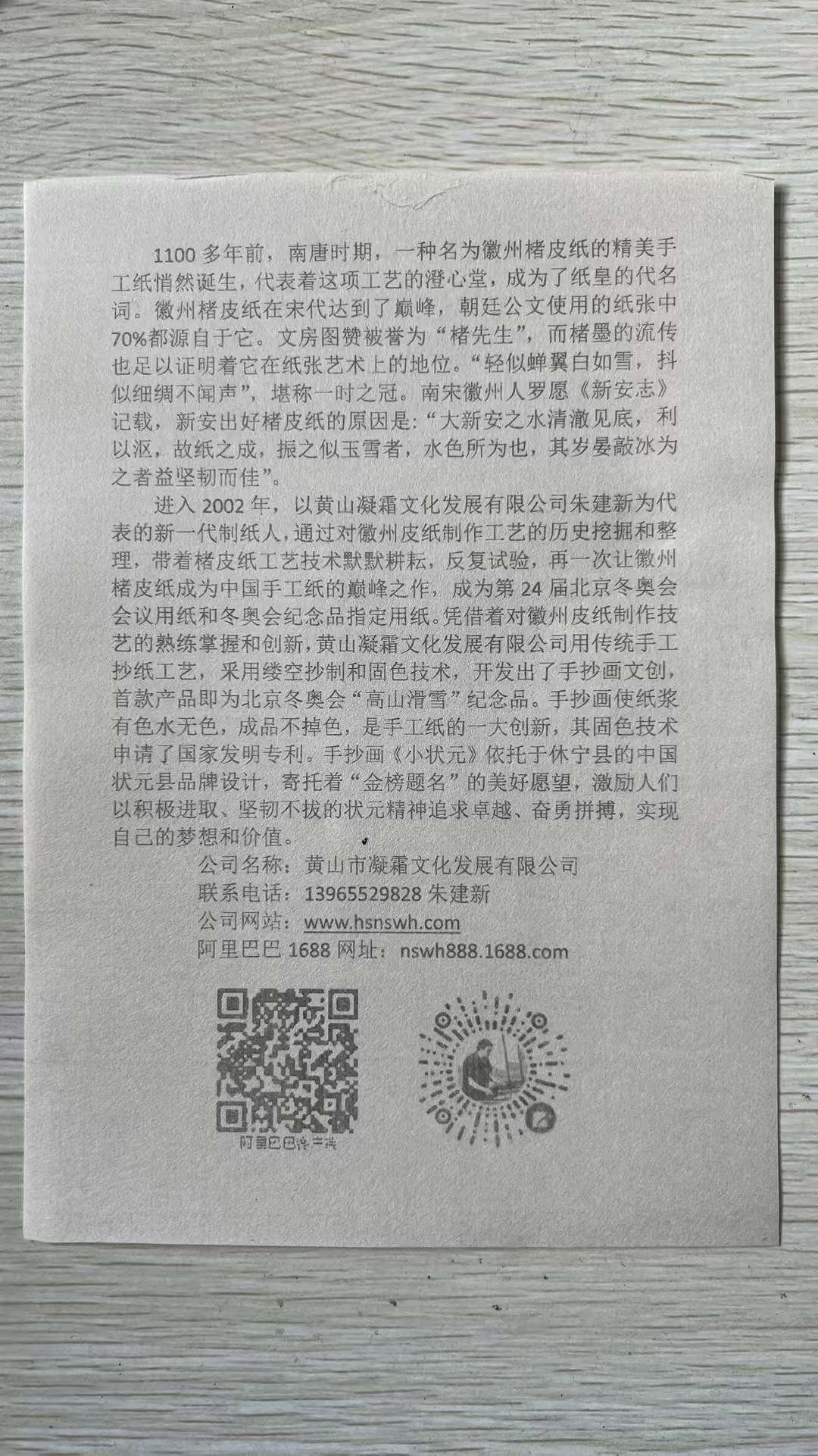 2020年公司實(shí)現(xiàn)了文化類(lèi)規(guī)上企業(yè),迄今已申請(qǐng)了15項(xiàng)發(fā)明專(zhuān)利,19項(xiàng)實(shí)用新型專(zhuān)利,其中已授權(quán)發(fā)明專(zhuān)利3項(xiàng),實(shí)用新型專(zhuān)利11項(xiàng);2022年,公司為北京第24屆冬季奧運(yùn)會(huì)提供楮皮紙和紀(jì)念品,非遺傳承人朱建新被授予北京2022年冬季奧會(huì)參與證書(shū),以感謝第24屆冬奧會(huì)取得圓滿成功做出的貢獻(xiàn)。2022年-2024年,朱建新被中國(guó)科技大學(xué)聘為《中國(guó)筆墨紙硯》全校公選課特聘導(dǎo)師;2023年,朱建新獲省級(jí)非遺傳承人稱(chēng)號(hào)、“黃山工匠”稱(chēng)號(hào)。