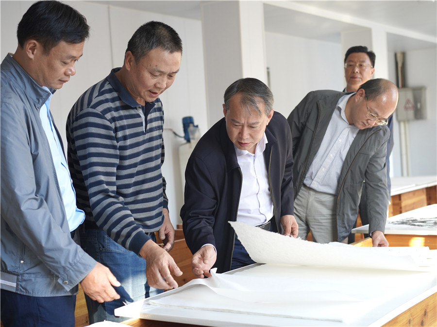 浙江省文化廳新安傳統(tǒng)文化調(diào)研,畫家樓森華、樓秋華和版畫藝術(shù)家王超在公司。徽州楮皮紙
